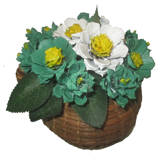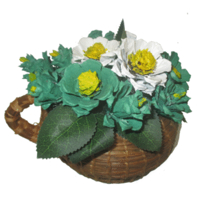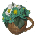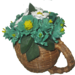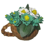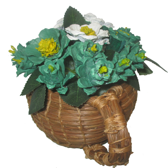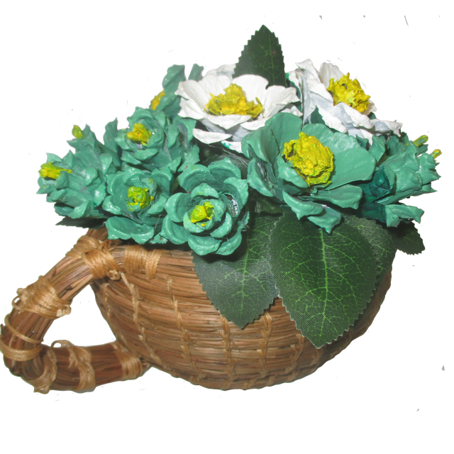 A green and white themed pinecone floral arrangement inspired by the popular beverage Matcha. Set in a cute, mug shaped handweaved pineneedle basket.