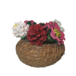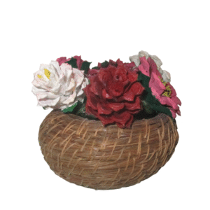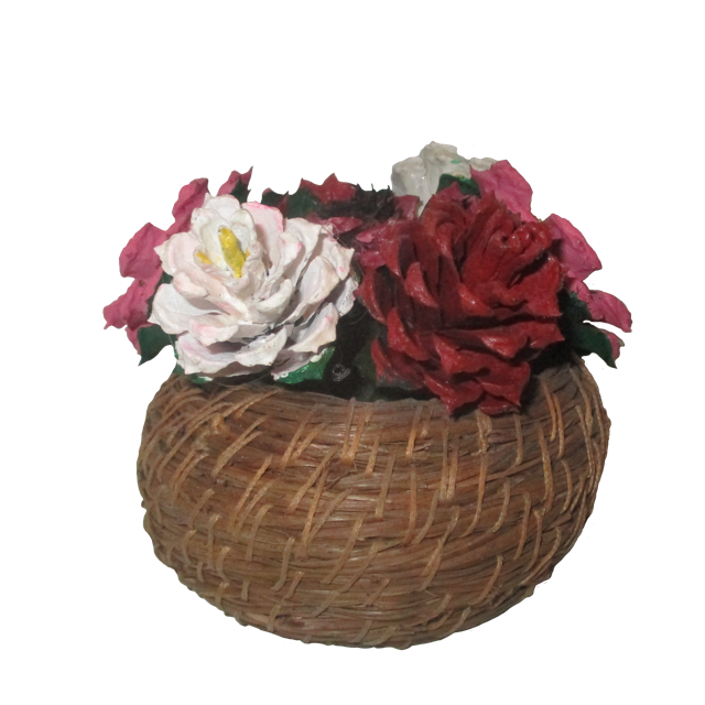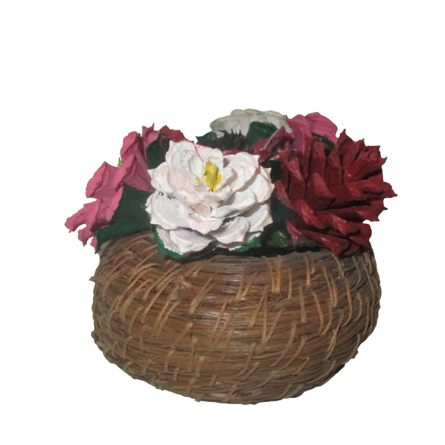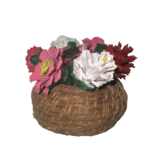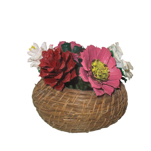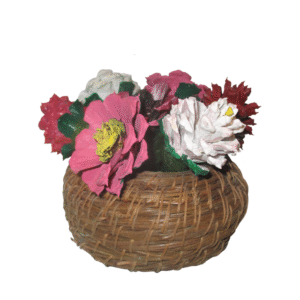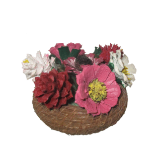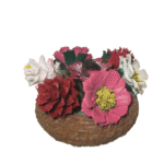 A lovely red themed floral arrangement inspired by the colors of roses. In a nest style pine needle basket. A simple floral arrangement that will not wilt. Made of individually cut and hand painted pine cone flowers. In a hand weaved pine needle basket.
